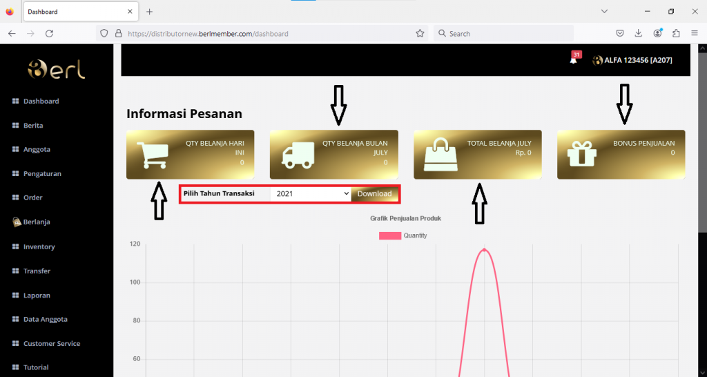 - Distributor juga dapat mendownload laporan penjualan yang ada pada dashboard yang ditunjukkan pada kotak merah