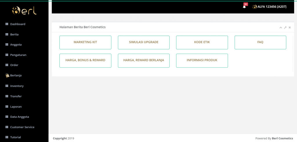 Menu Berita Distributor terdiri dari Marketing Kit, Simulasi Upgrade, Kode Etik, FAQ, Harga, Bonus&Belanja, Harga, Reward Berlanja dan Informasi Produk