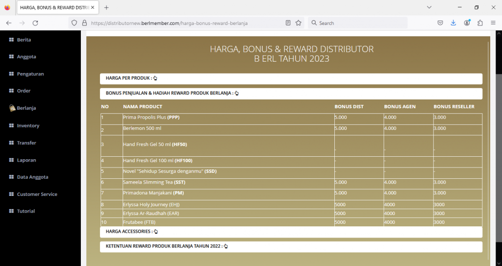 Harga, Reward & Belanja, berisi harga per produk berlanja, bonus penjualan & hadiah reward berlanja, harga accessories, dan ketentuan reward produk berlanja