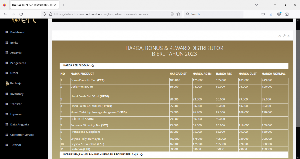 Harga Produk Berlanja, yaitu harga per produk setiap level member dan harga normal