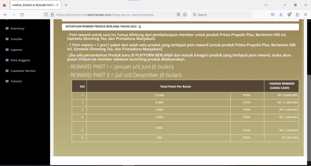 Bonus Penjualan dan hadiah produk Berlanja, bonusnyang didapatkan setiap Member