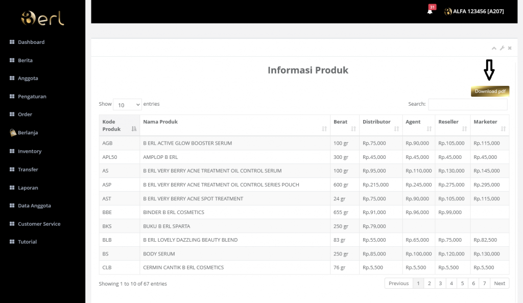 Informasi Produk akan menampilkan nama nama produk berl beserta kode produknya, user juga dapat mendownload pdf yg berisi informasi tentang produk Berl dengan klik tombol download seperti tanda panah berikut