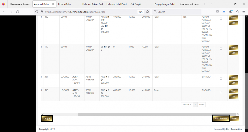 ceklis pada kolom proses atau klik pilih semua untuk approve semua order, kemudian klik lanjut