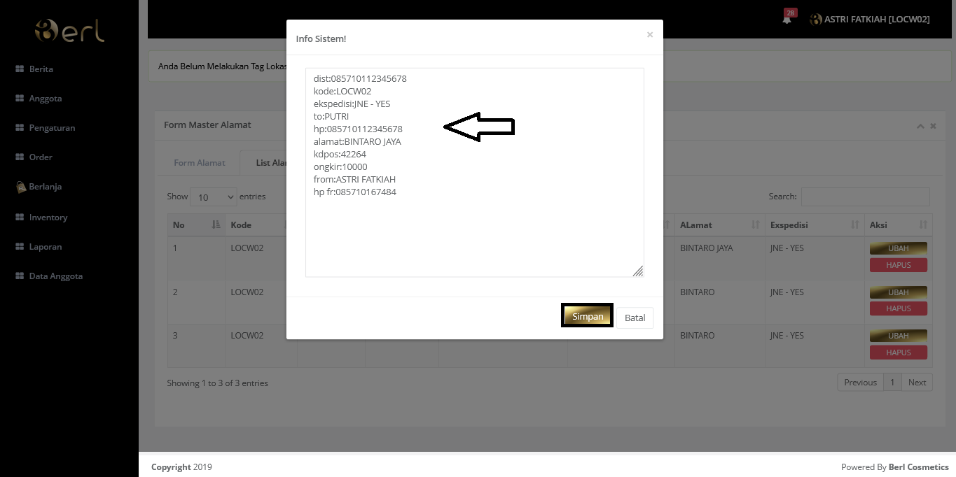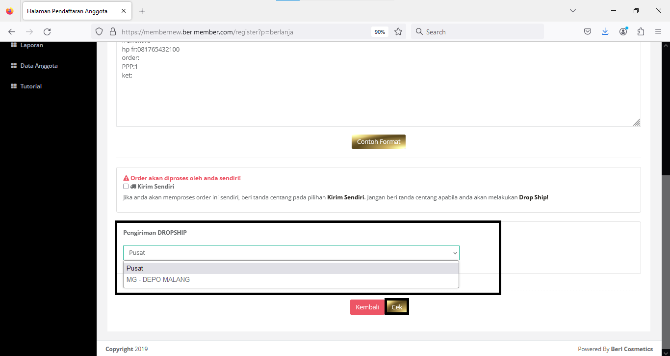 Selanjutnya pilih pengiriman dropshi atau kirim sendiri. Jika tidak sesuai, Distributor bisa menolak orderan dari anggota sehingga tidak dapat diproses.