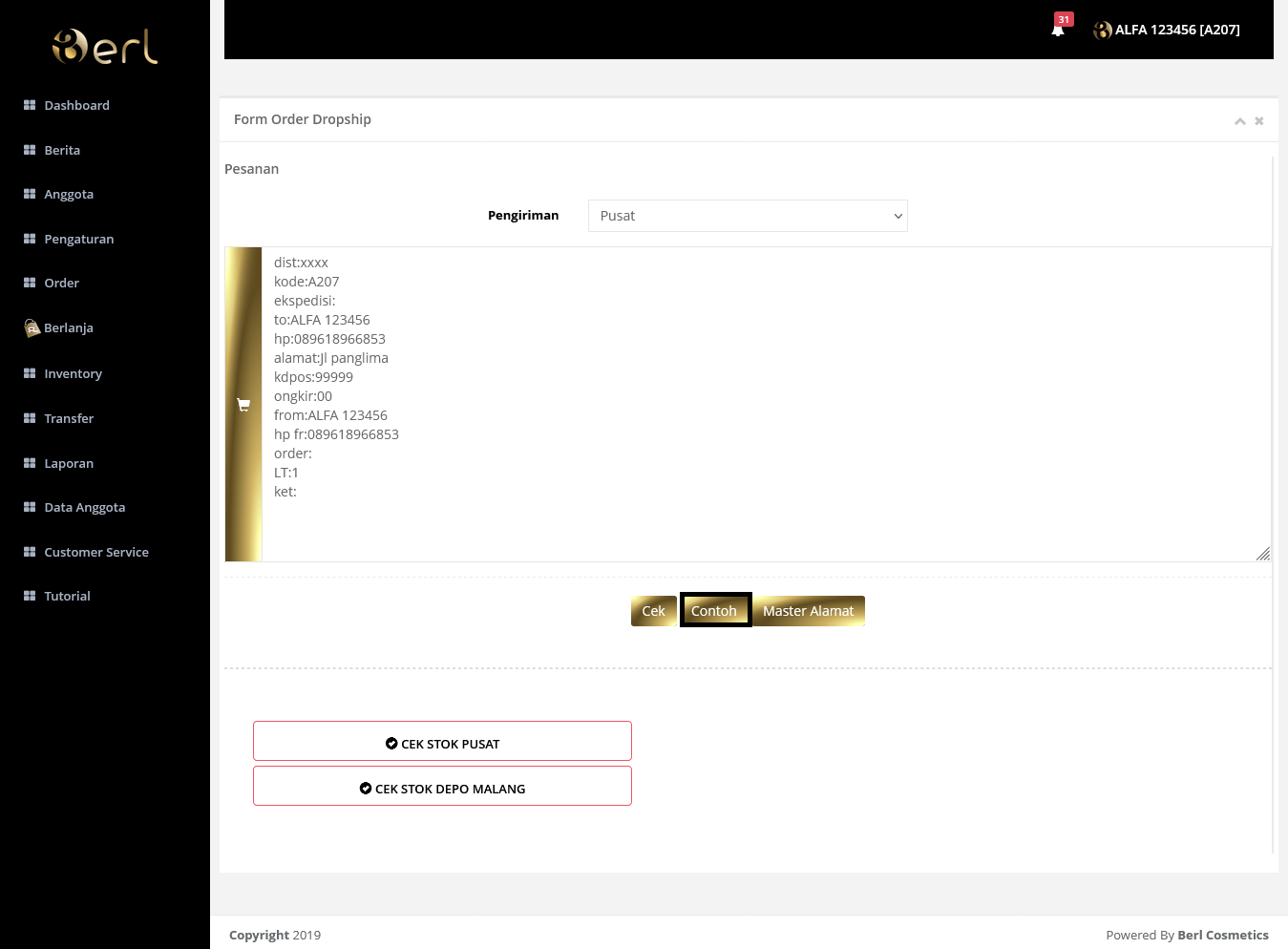 Pada menu order Dropship pengiriman dilakukan dari pusat, Distributor mengisi form order.