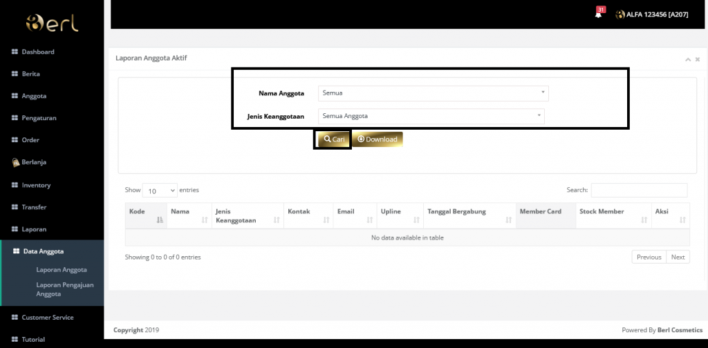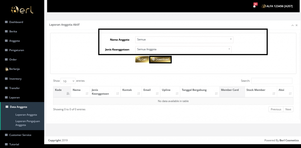 Pada menu Data Anggota, user/distributor dapat melakukan pencarian dan mengunduh data anggota yang aktif.