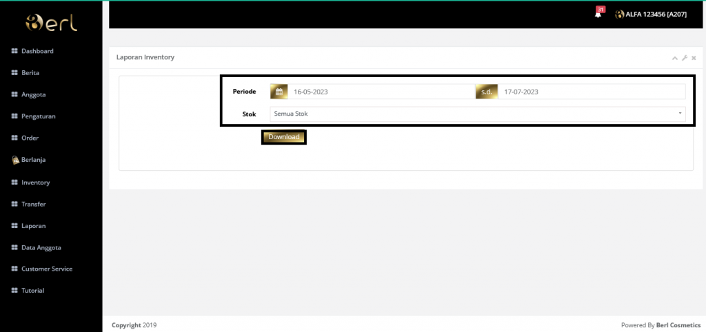 Pada menu Inventory, User/Distributor dapat mengunduh laporan inventory yang dimiliki. Pilih Laporan inventory, masukkan periode dan pilih stok produk kemudian klik tombol