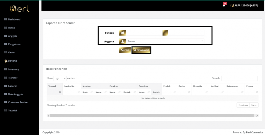 Pilih laporan kirim sendiri pilih tanggal periode, pilih anggota kemudian klik tombol download untuk mendownload Laporan