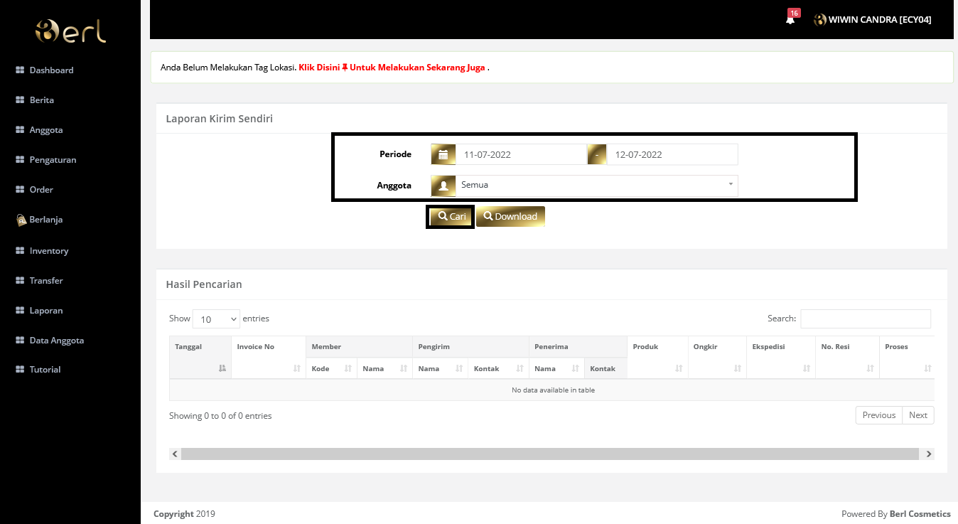 Pilih Laporan kirim sendiri pilih tanggal periode, pilih anggota kemudian klik Cari untuk melakukan pencarian