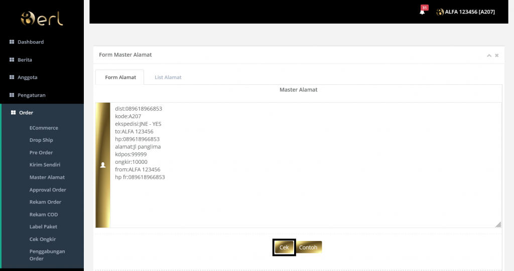 Distributor mengisi form master alamat, klik tombol contoh untuk melihat contoh form