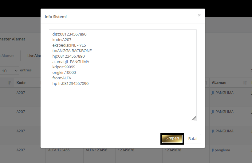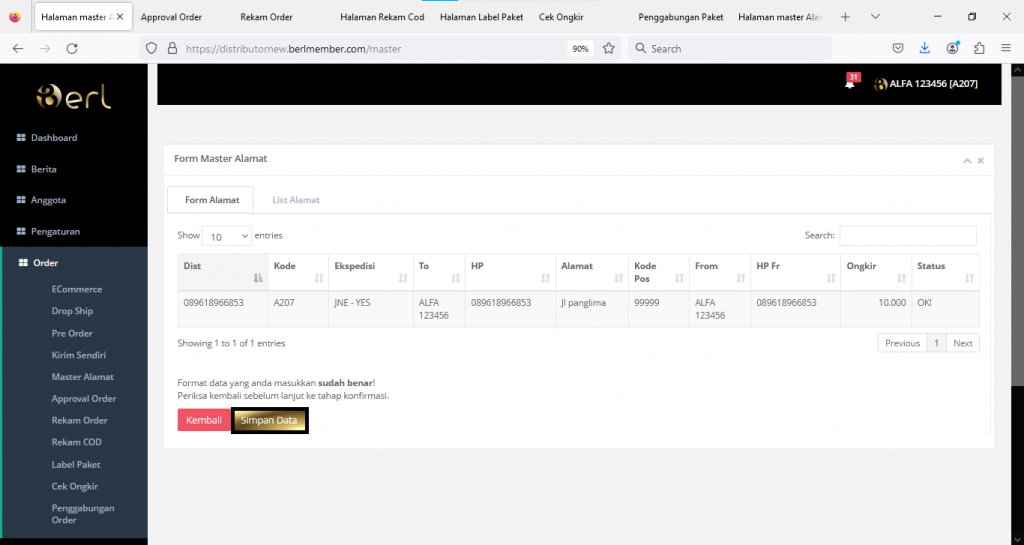 Simpan data master alamat yang sudah ditambahkan