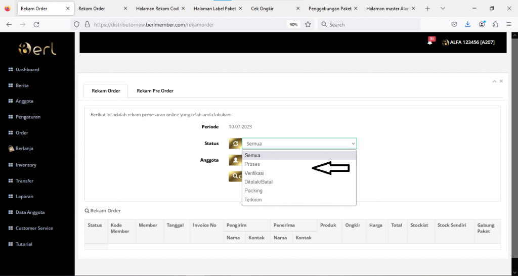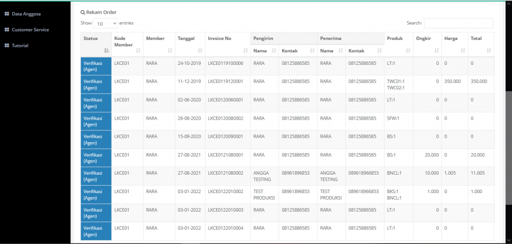 Pada Rekam Order, Distributor bisa melihat rekam pemesanan online yang telah dilakukan