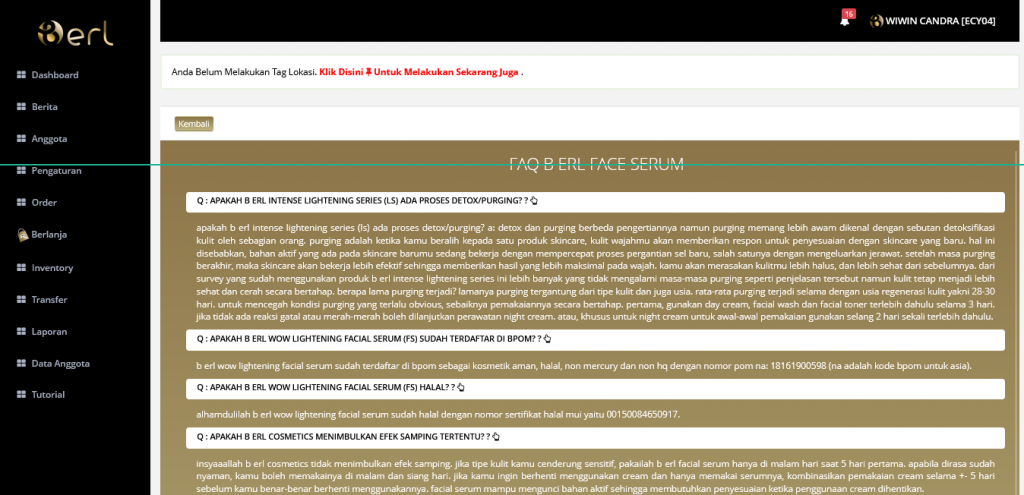 FAQ, yaitu berisi daftar pertanyaan dan jawaban seputar produk produk berl cosmetics yang sering ditanyakan.