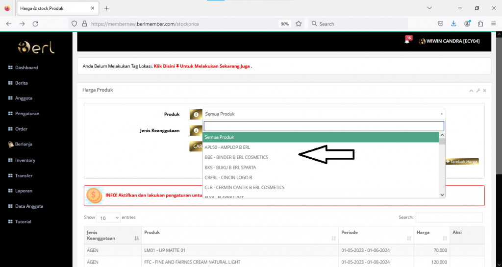 - Pilih Produk yang akan dicari seperti yang ditunjukkan tanda panah berikut