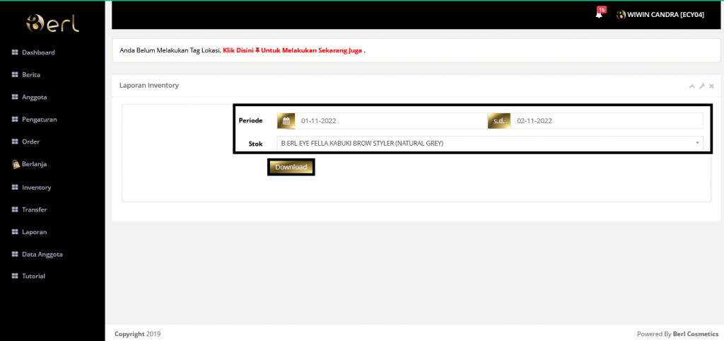 Pada menu Inventory, Agen dapat mengunduh laporan inventory yang dimiliki. Pilih Laporan inventory, masukkan periode dan pilih stok produk kemudian klik tombol