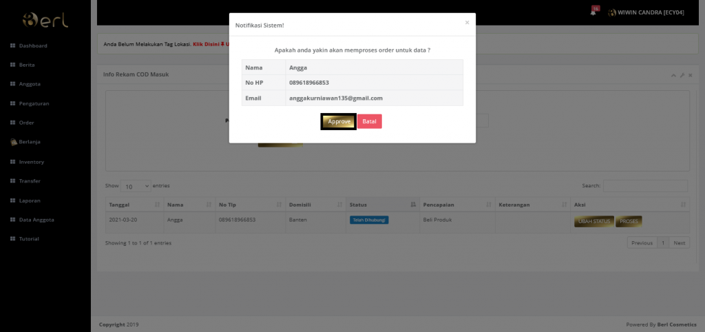 Agen dapat memproses order COD, klik Proses dan akan muncul pop up. Lalu klik Approve