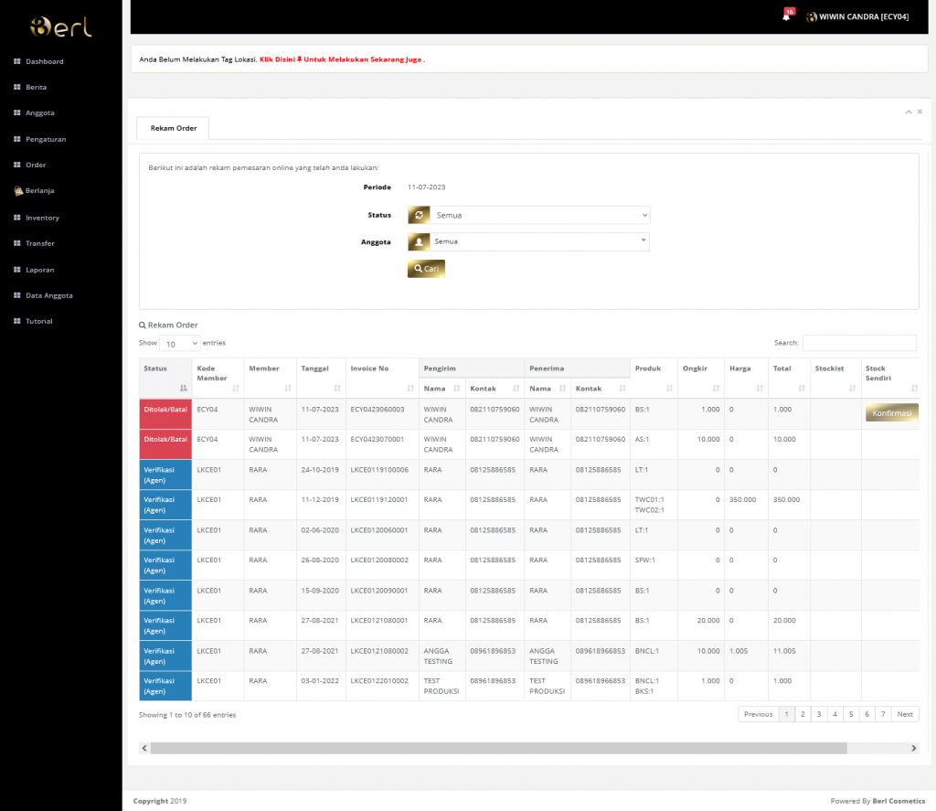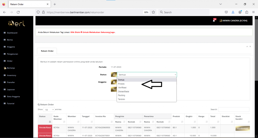 Kemudian Agen pilih status pesanan (proses,verifikasi, tolak, packing, terkirim)