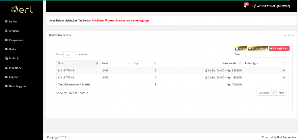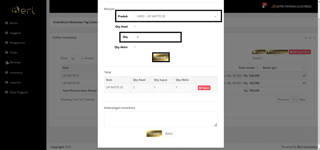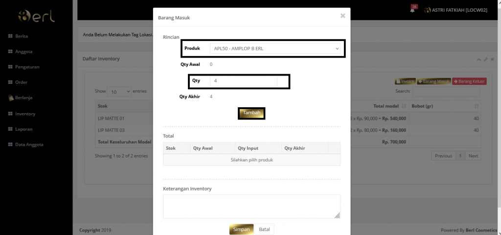 Pada daftar inventory akan menampilkan total keseluruhan stok dan modal yang dimiliki