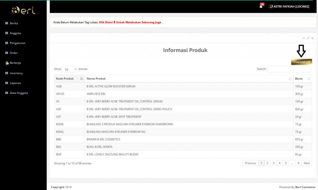 Informasi Produk akan menampilkan nama nama produk berl beserta kode produknya, Reseller juga dapat mendownload pdf yang berisi informasi tentang produk Berl dengan klik tombol download seperti tanda panah berikut