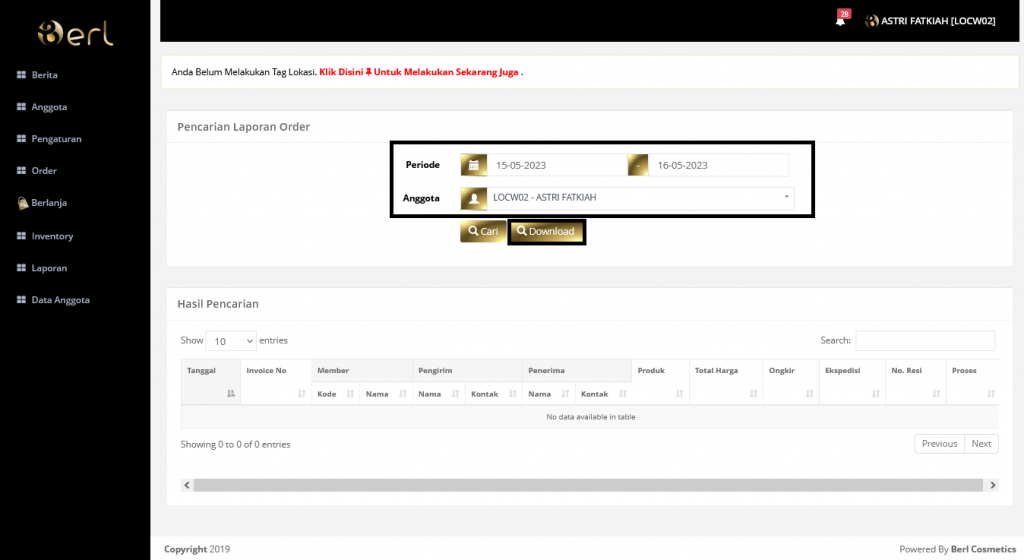 Pilih menu laporan order, lalu pilih periode dan Anggota kemudian klik download