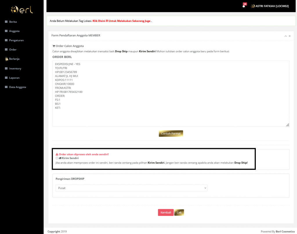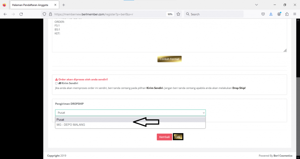 Kemudian calon anggota harus melakukan orderan dengan mengisi form order calon anggota, klik tombol contoh untuk melihat format order.