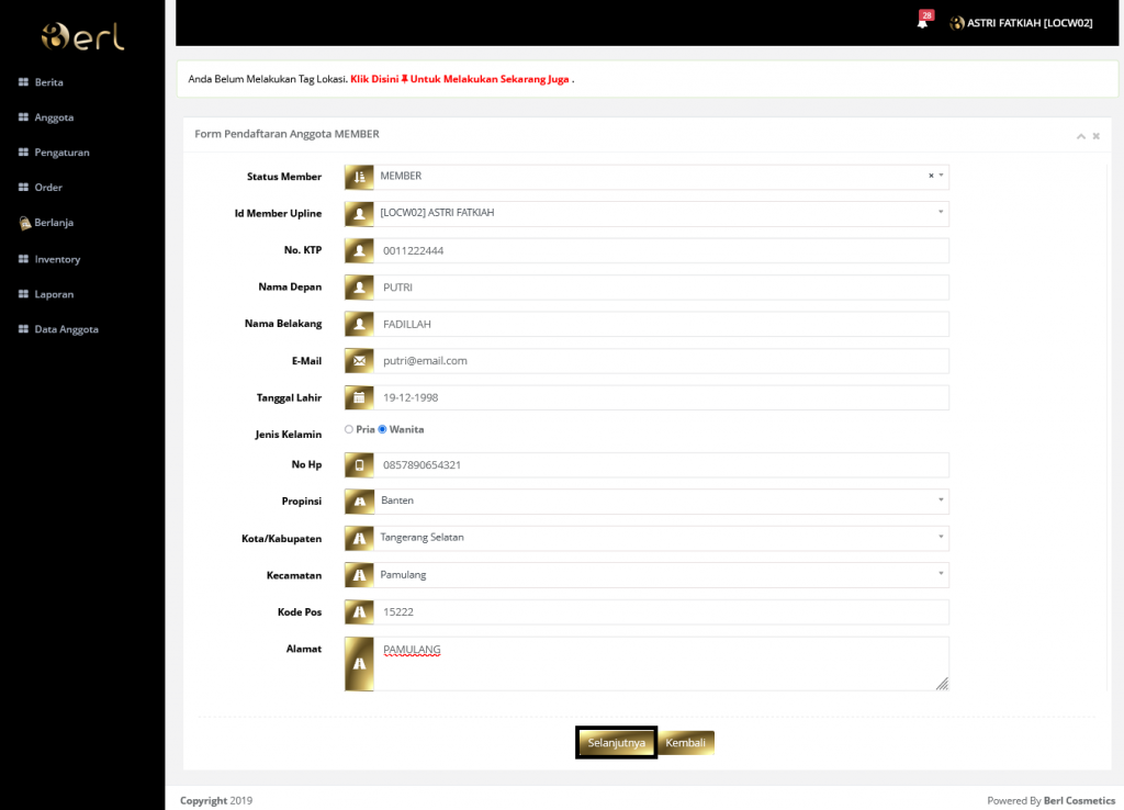 Reseller bisa mendaftarkan calon hanya anggota Member/Marketer, dengan mengisi data diri calon anggota pada form pendaftaran calon anggota. Lalu klik tombol selanjutnya untuk proses berikutnya