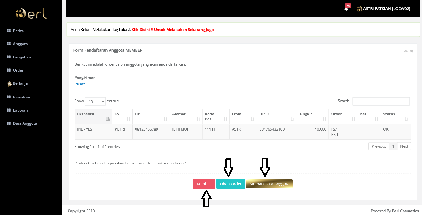 Jika sudah, anda akan masuk ke halaman rincian order calon anggota.